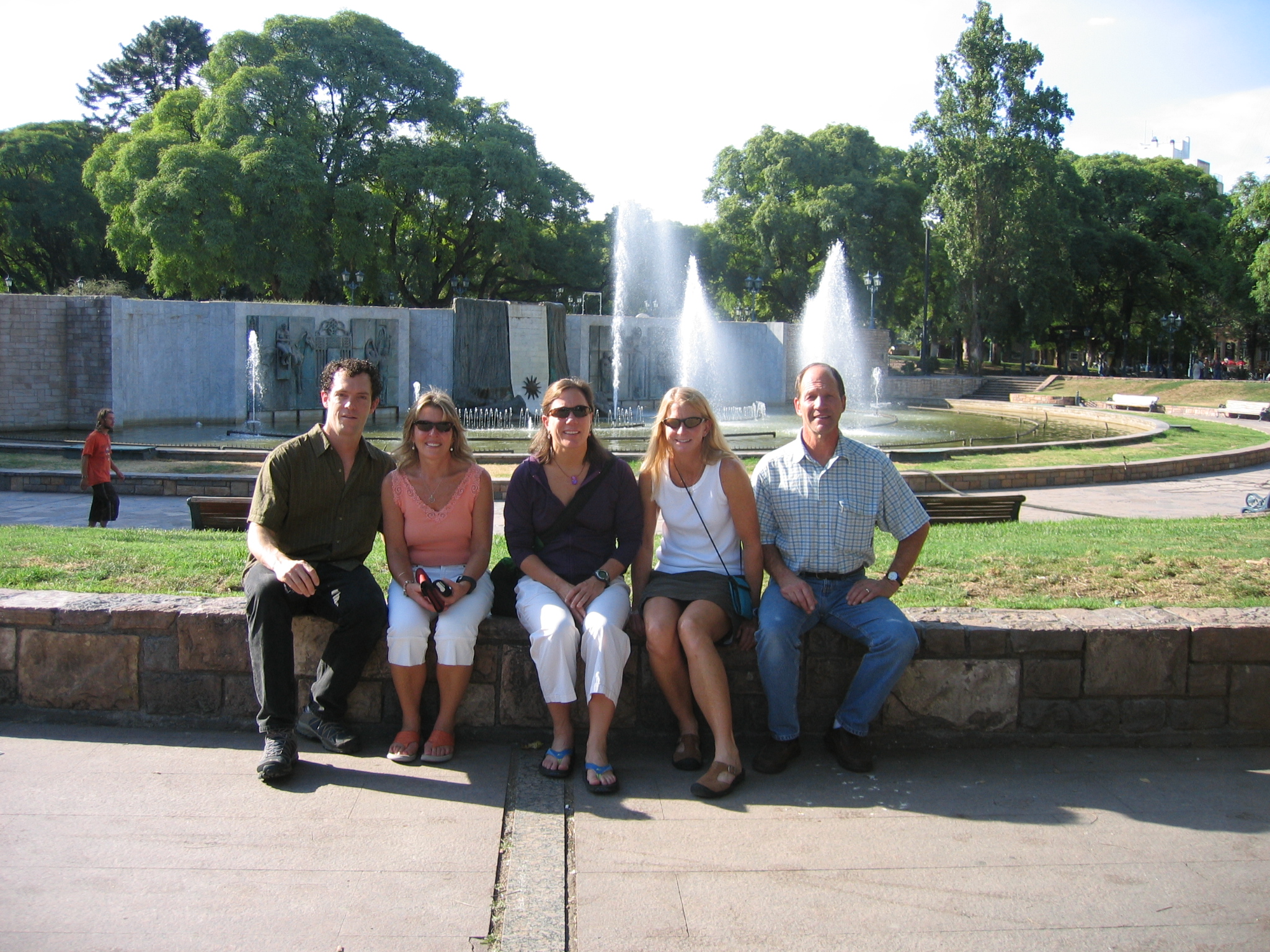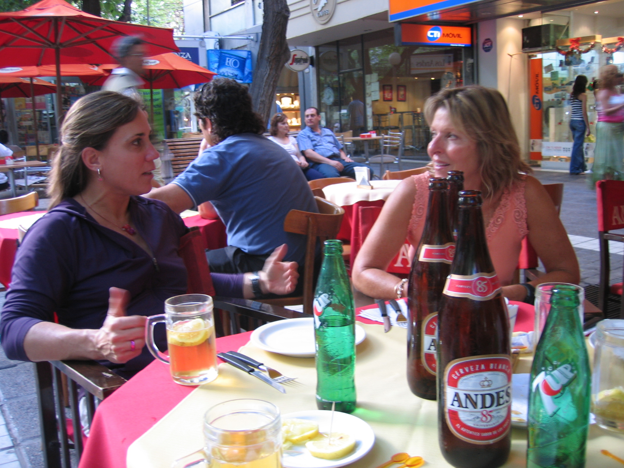 After a few hours relaxing in our rooms, the five of us met in the hotel lobby and walked to a little side avenue where there are outdoor cafes and no cars. We ordered two pizzas (the best had ham, green olives, pineapple and caramelized brown sugar that left our fingers sticky). We also successfully got Louise, at the age of 53, to enjoy the first beer of her life by mixing Andes brand beer with 7Up.